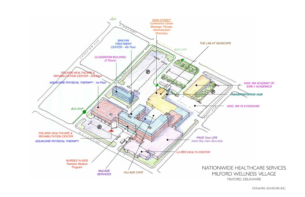 The Milford Wellness Village is an innovative, multi-use development initiative committed to delivering integrated health, education, and other services to the City of Milford, Kent and Sussex Counties, and the State of Delaware. Coordinated services are being provided by a select mix of like-minded organizations and service providers who equally share the desire to improve the health and well-being of area residents and reduce overall costs. The Village has been carefully designed based on interviews with the community. Village components and service provider placement have been determined based on traditional town planning principles and are designed to maximize the user experience.